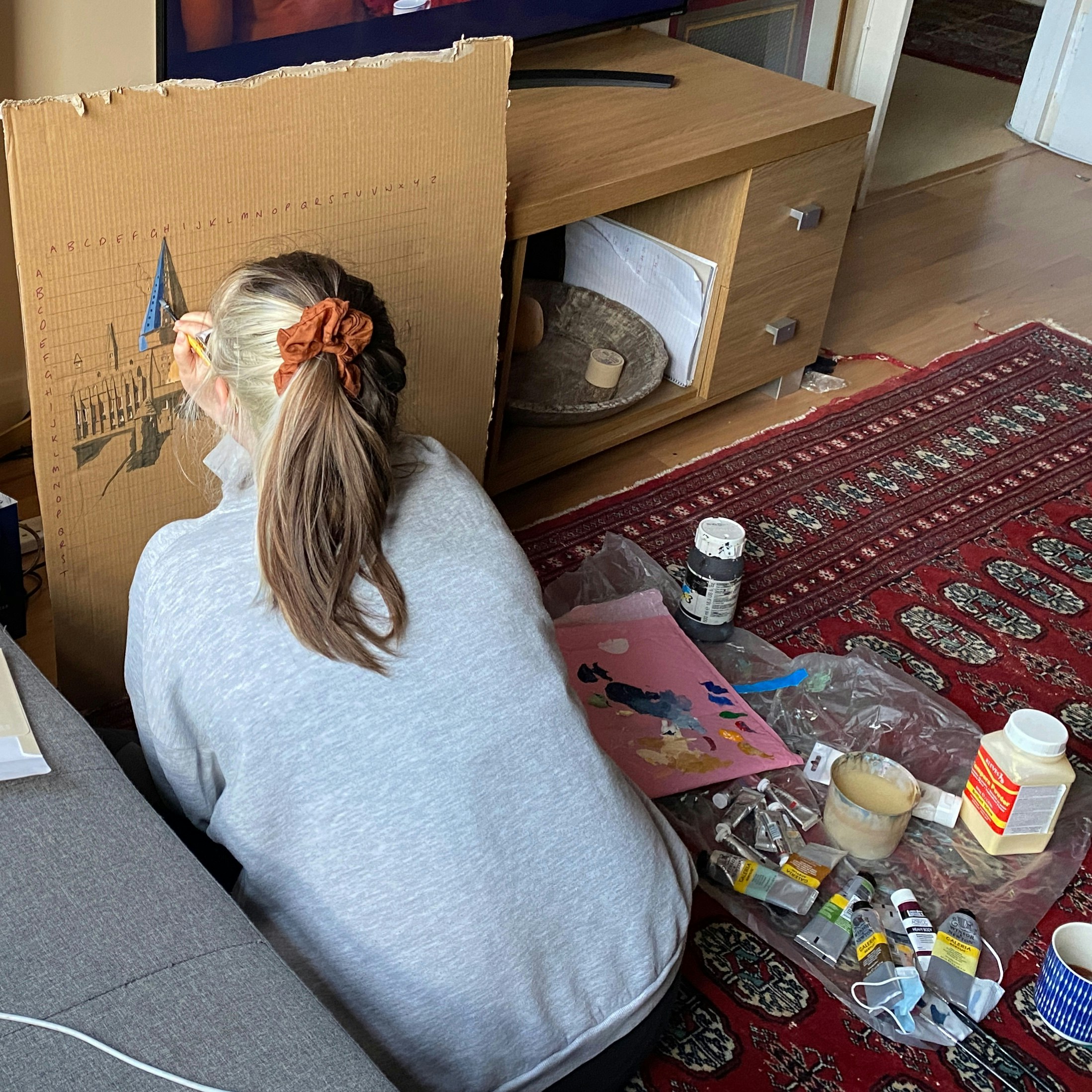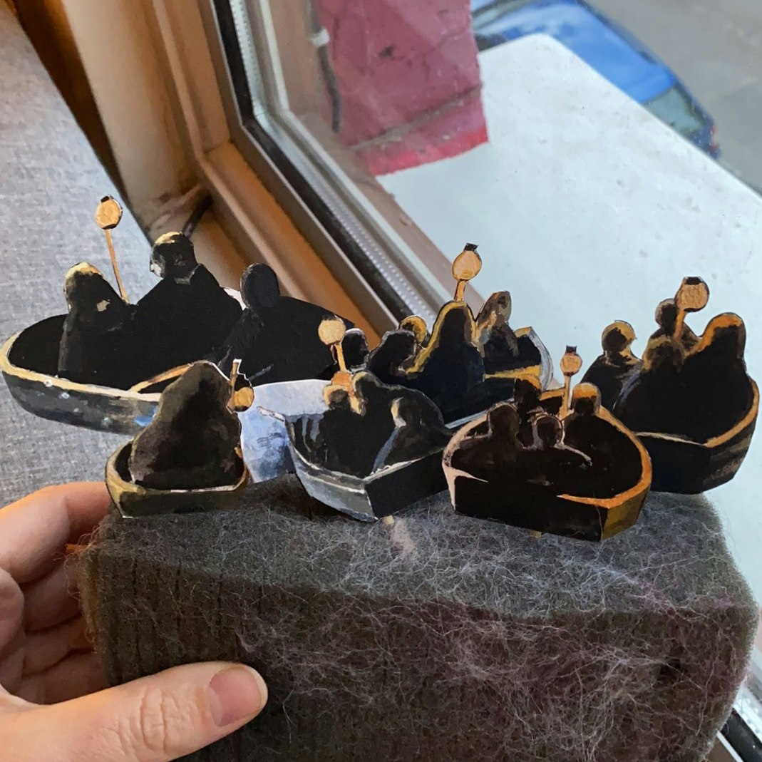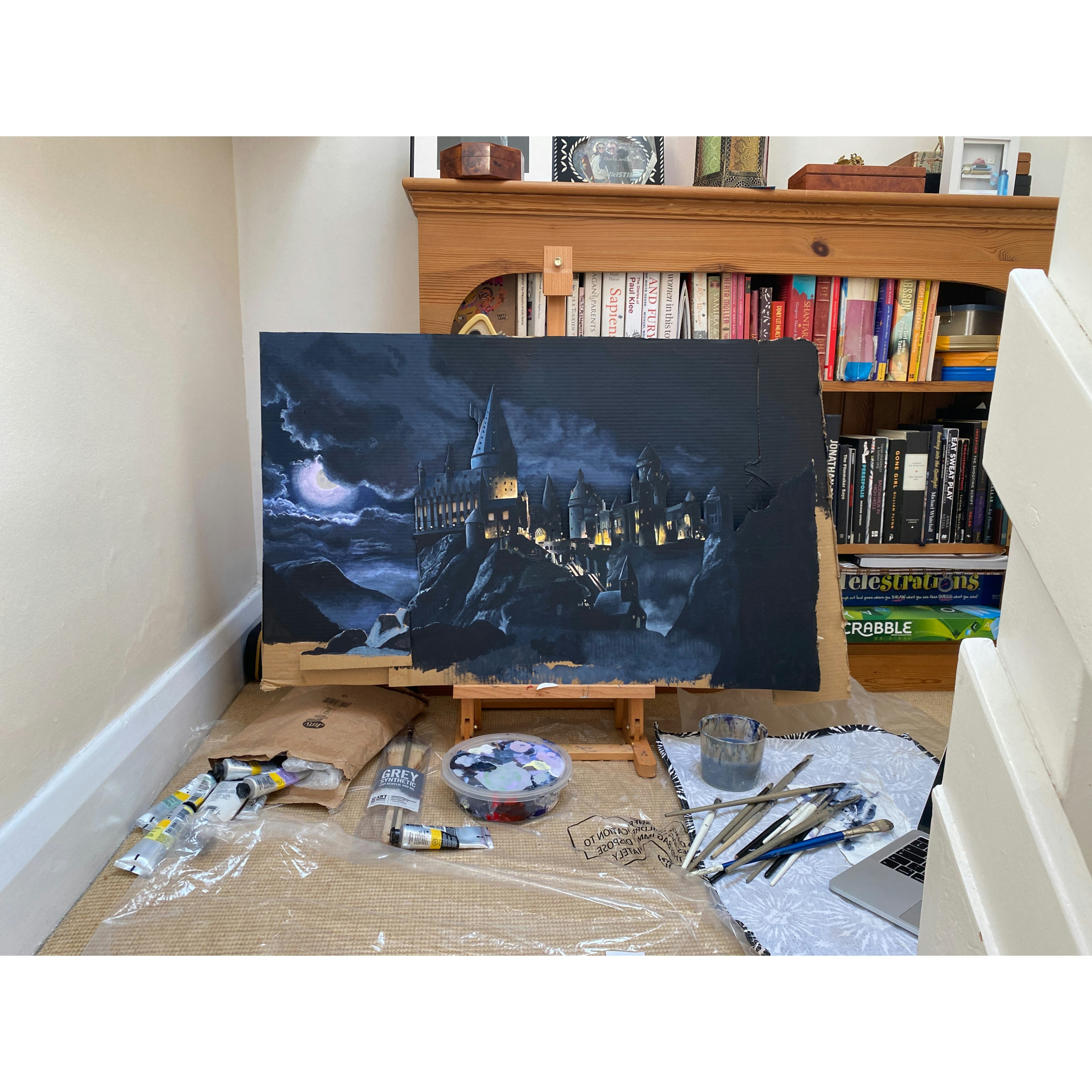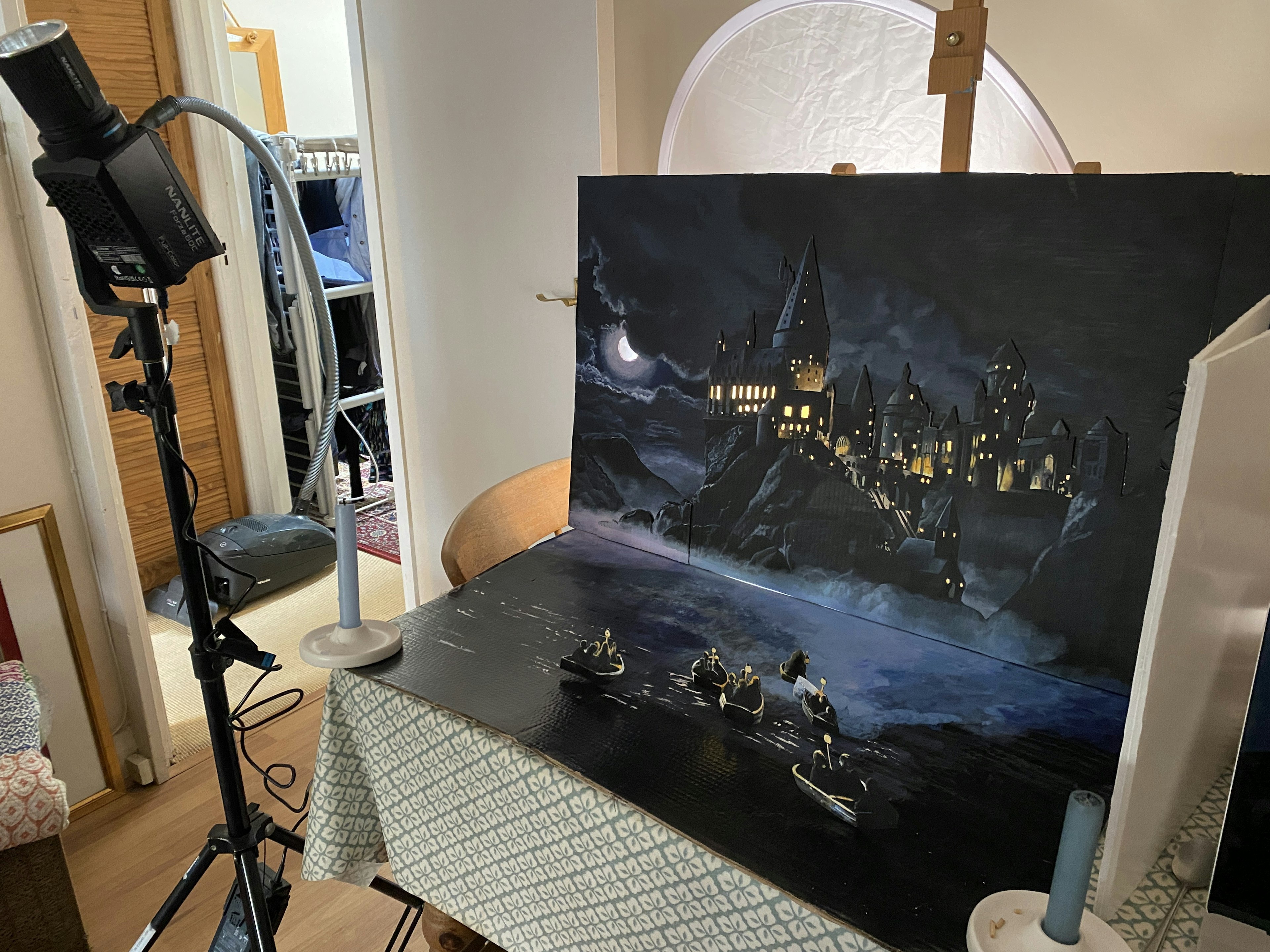 Made from a cardboard box, acrylic paint & lighting gels, fans of the franchise will recall it as the first time we see Hogwarts appear out of the mist.