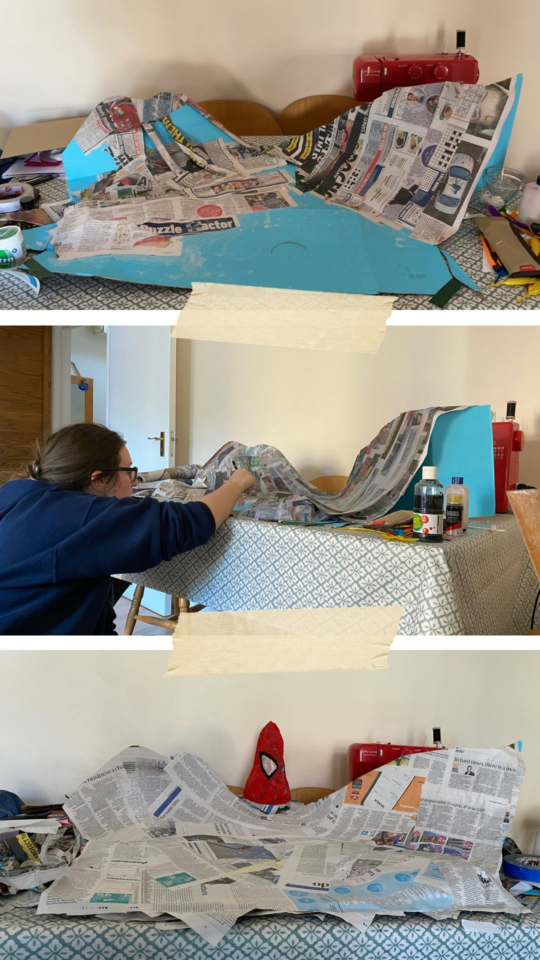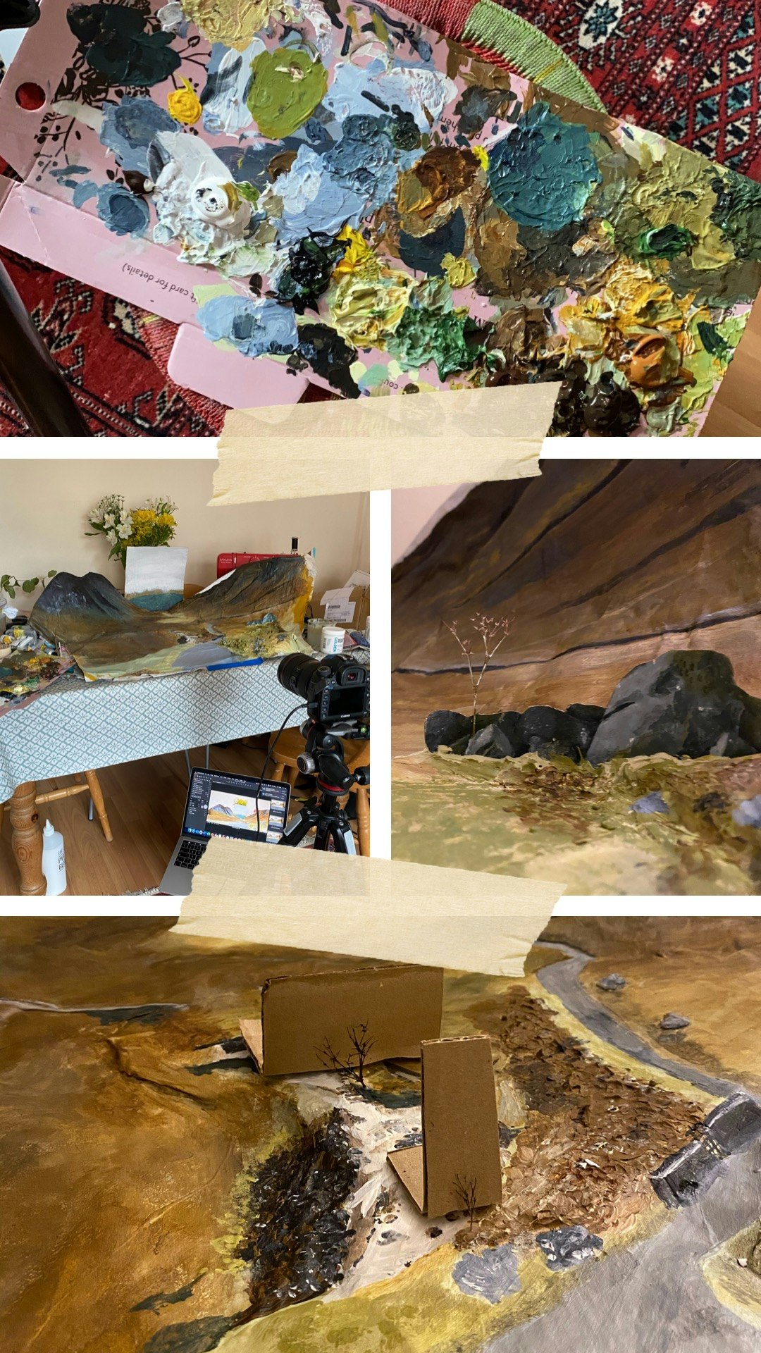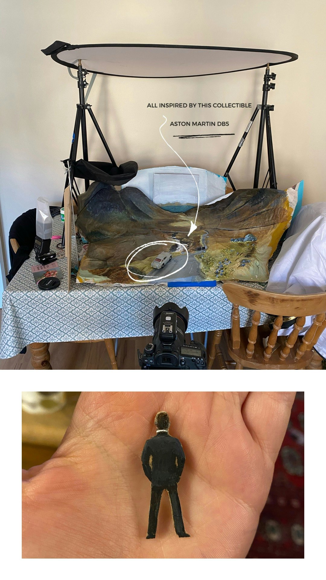 And so Quaran-Scenes was borne. Created in perspective with a minature Aston Martin DB5 for scaling reference, I began recreating the scottish highlands using resources I could find already within my house (until the paint resources ran dry). With the exception of a week long break as I waited patiently for the overworked delivery driver to bring the goods, the project beginning to end took 3 weeks. Materials included a cardboard box from a flower delivery, papier mâché made from free news papers and a flour/water solution, dry gypsophilia (from said arrangement) and a little moulding paste.